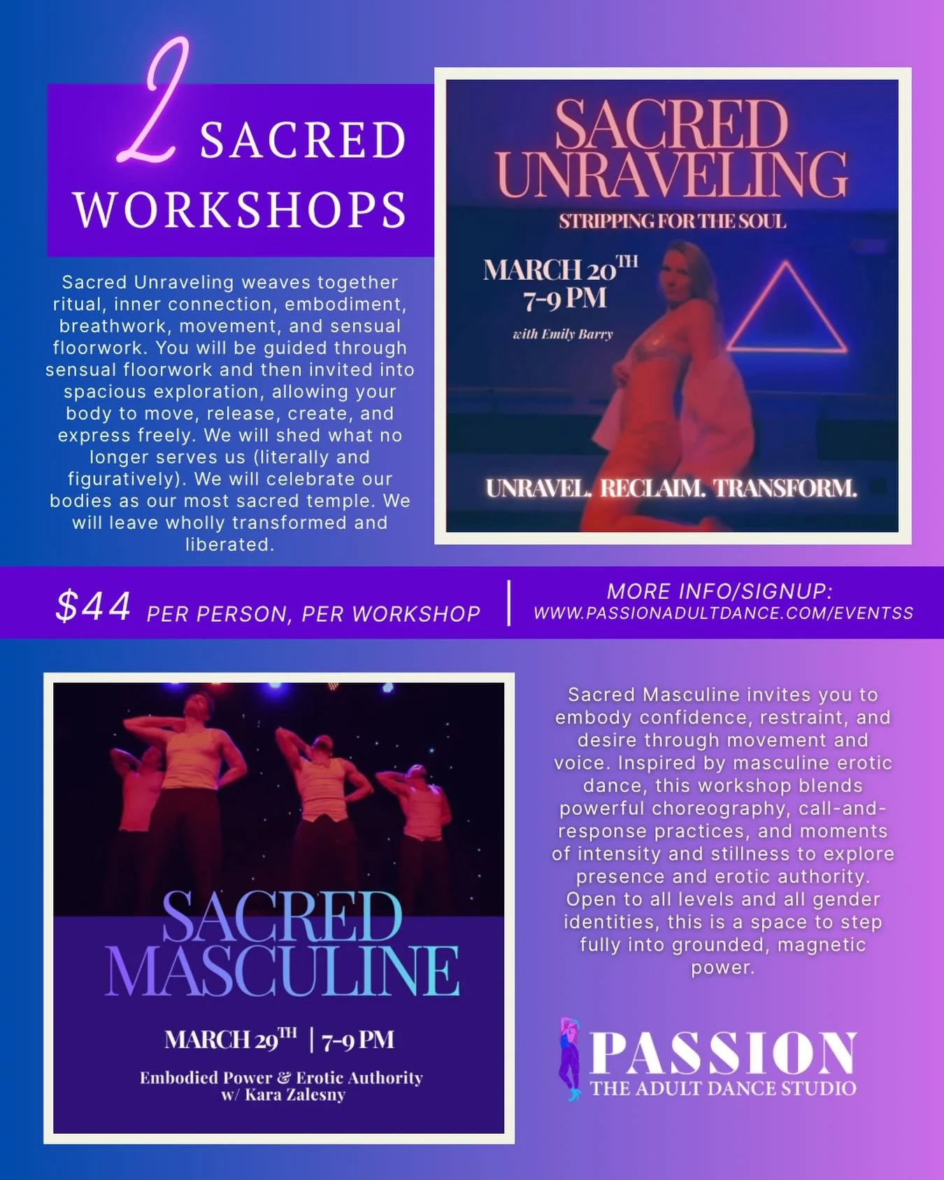 β¦a dance studio made just for adults ages 18 and up to express themselves through movement and self-love. Itβs a place for you to drop all of your adult responsibilities at the door and just be with yourself and a community of others expressing themselves through dance. The music is loud, the lights are low, and the space is a sanctuary of acceptance. You donβt need prior dance experience to take class, you just need to be willing to look at yourself in the mirror and smile until you laugh. Who knows, maybe youβll find your PASSION through movement!